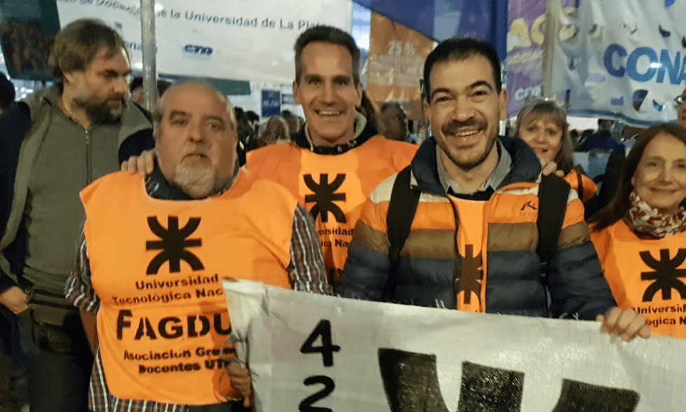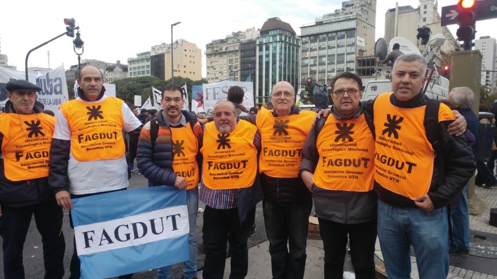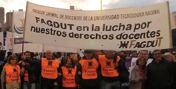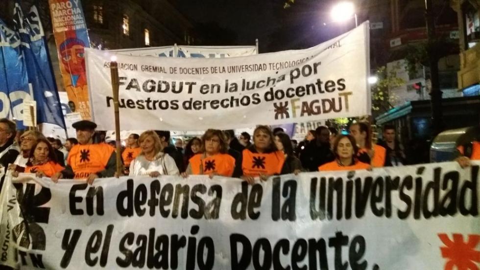 Frente a un cuadro de situación crítico de la economía argentina con una corrida bancaria cuyo costo fue equivalente a 3 presupuestos universitarios, que nos dejó con los salarios devaluados y una inflación acumulada hasta abril de un 10%; la comunidad universitaria se movilizó por la Avenida de Mayo hasta el Cabildo. Allí se realizó un acto multitudinario en el cual, nuestro gremio estuvo representado por la alocución de Ricardo Mozzi, paritario por FAGDUT. En su discurso trazó una clara línea histórica remarcando que en 1918 se produjo el movimiento de reforma universitaria, para luego referir al hito histórico que significó la creación de nuestra universidad y la inversión en ciencia, tecnología y universidades de los gobiernos populares. Estas nos llevaron al desarrollo de tecnologías de punta y pusieron a la universidad argentina y sus graduados entre los más distinguidos del mundo. En contraste, la realidad actual en la que el sistema científico y universitario argentino atraviesa un ahogo presupuestario, producto de la decisión política de achicarlo y volver a una matriz productiva centrada en las materias primas sin valor agregado y sin participación en el desarrollo tecnológico.