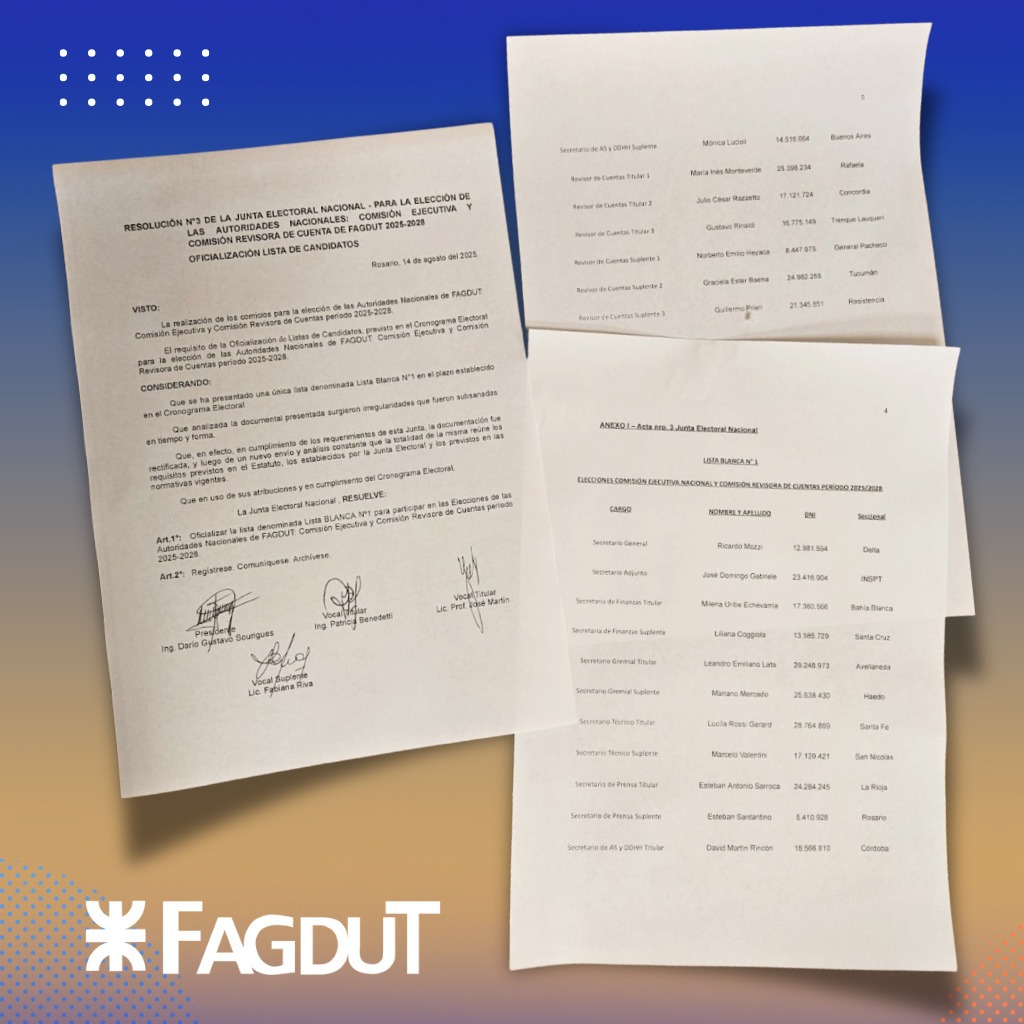En el marco de la renovación de las Autoridades Nacionales de FAGDUT para el período 2025-2028, la Junta Electoral informa que esta autoridad electoral ha oficializado la LISTA BLANCA N.º 1 para los comicios del 4 de Octubre del 2025, conforme a lo establecido por el cronograma electoral. JUNTA ELECTORAL NACIONAL